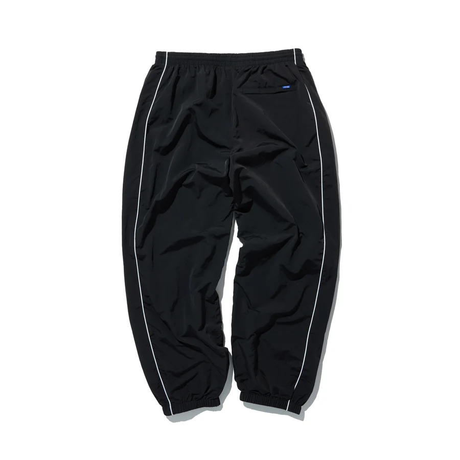 Nylon double panel track pant with adjustable drawcord hem and logo patch.